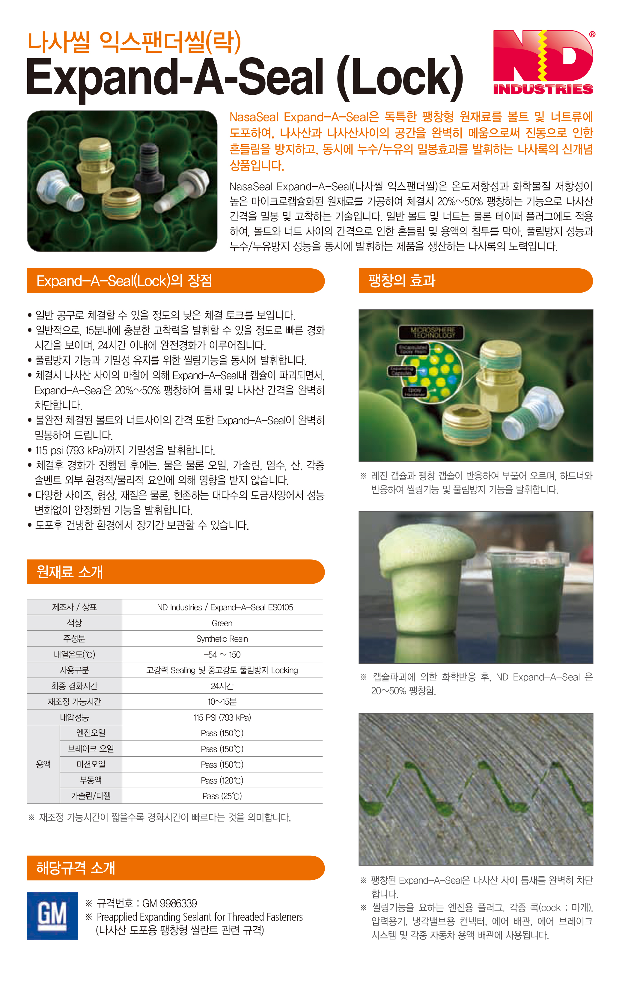 Ç®¸²¹æÁö (Locking) ¿Í ´©¼ö/´©À¯¹æÁö (Sealing) °¡ µ¿½Ã¿¡ °¡´ÉÇÑ À¯ÀÏÇÑ Ç®¸²¹æÁö Á¢ÂøÁ¦·Î,ND (¹Ì±¹ ¾Øµð) »çÀÇ Expand-A-Lock(Seal) ÀͽºÆÒ´õ¶ô(¾Á) ·Î Á¦Á¶ÇÕ´Ï´Ù.* ¹Ì±¹ GM 9986339 ¿¡ µî·ÏµÇ¾î ÀÖ½À´Ï´Ù.[³»¿¿Âµµ ¹üÀ§]¿µÇÏ 50µµ¿¡¼ 150µµ ±îÁö Àû¿ë°¡´ÉÇÕ´Ï´Ù.[³»¾Ð¼º´É]~ 115 psi (793 kPa)[³»ÈÇмº]´Ù¾çÇÑ ¿ëÁ¦ ¹× ¿ë¾× ÀúÇ×¼º ¿ì¼ö¾Æ·¡ À̹ÌÁö´Â ¹Ì±¹ ND»ç (www.NDindustries.com) ¿¡¼ Á¦°øµÇ¾ú½À´Ï´Ù.(Image below is provided by ND Industries Incorpation in the USA.)